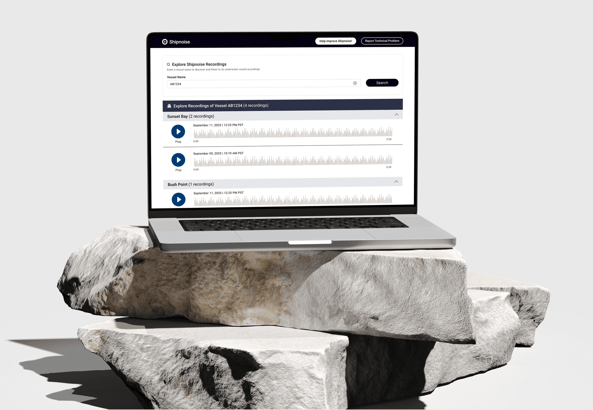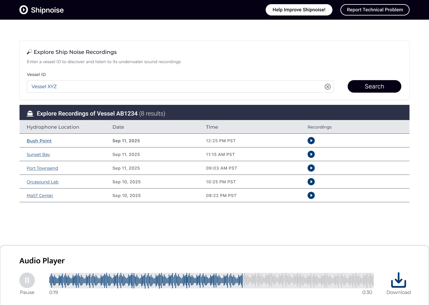 Using Orcasound's network of hydrophones along the Salish Seas, we built a database of sounds which allows pilots to playback their ship noise and utilize this new information when planning future routes. Overall, this would create a quieter environment for the Southern Resident Killer Whales and marine life while minimizing disruptions to shipping routes.