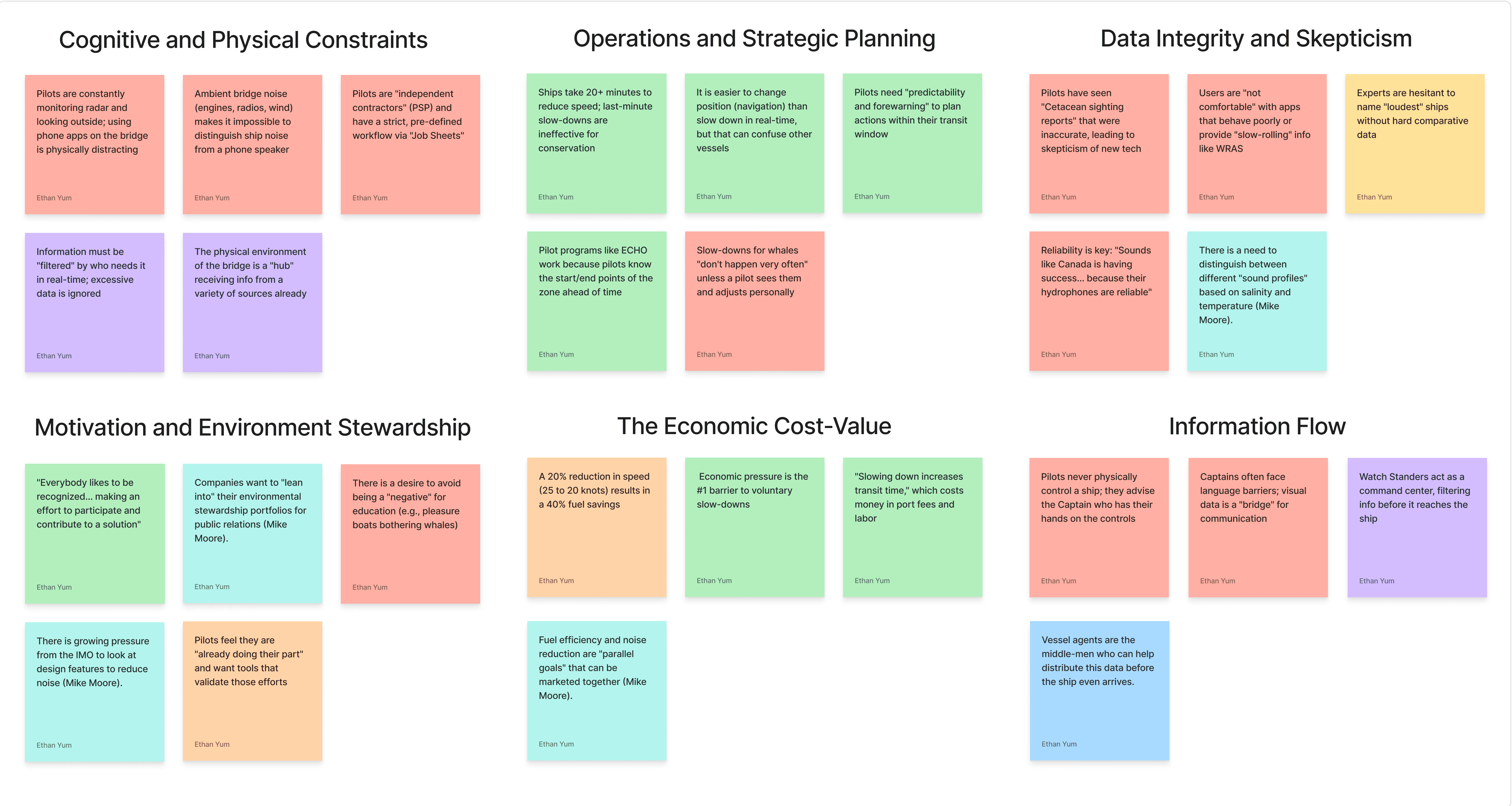 Before moving into high-fidelity design, it was critical to understand the complex maritime ecosystem of the Salish Sea. We conducted targeted interviews with Subject Matter Experts (SMEs), including ship pilots, logistics experts from the PMSA, and vessel agents, to move beyond technical assumptions and uncover the human constraints of maritime navigation.